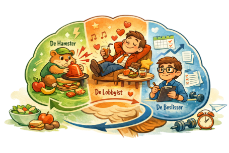 En daar zit meteen de kracht én de valkuil. De Lobbyist kijkt niet naar lange termijn of gezondheid. Hij kijkt naar nu. Wat geeft op dit moment verlichting, plezier of comfort? Daarom kan hij ineens hard gaan roepen, vooral als je moe bent, gestrest bent of emoties voelt. Niet omdat je zwak bent, maar omdat dit systeem bedoeld is om je snel beter te laten voelen. Het lastige is: de Lobbyist praat er graag tussendoor. Terwijl een ander deel van je brein plannen maakt en rationele keuzes wil maken, fluistert hij: “Ach joh, eentje kan toch wel?” En hoe vaker je luistert, hoe sterker zijn stem wordt. Dat is geen gebrek aan discipline, maar simpelweg hoe je brein leert.